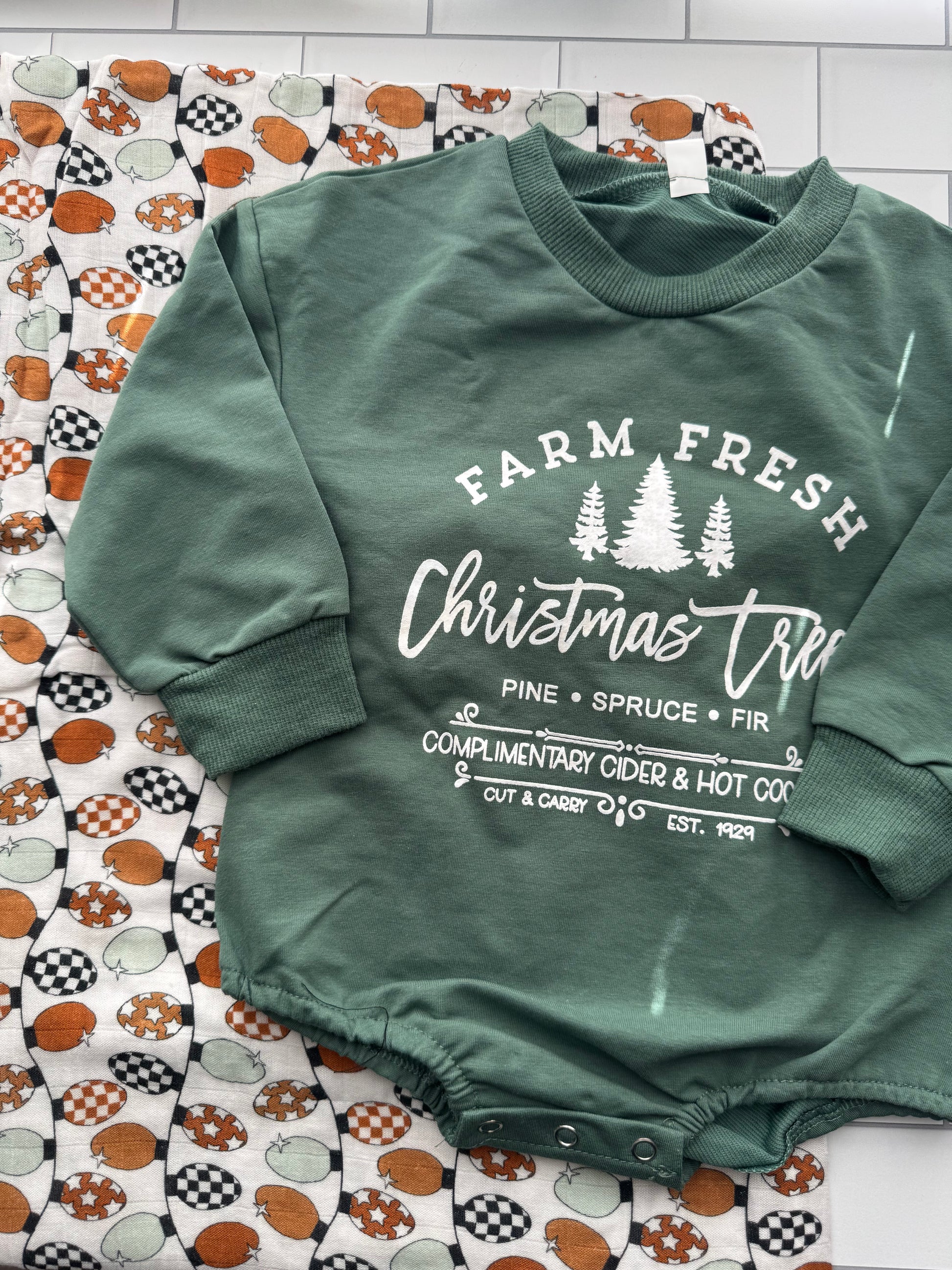🎄 Green – “Farm Fresh Christmas Trees” design with matching seasonal print swaddle