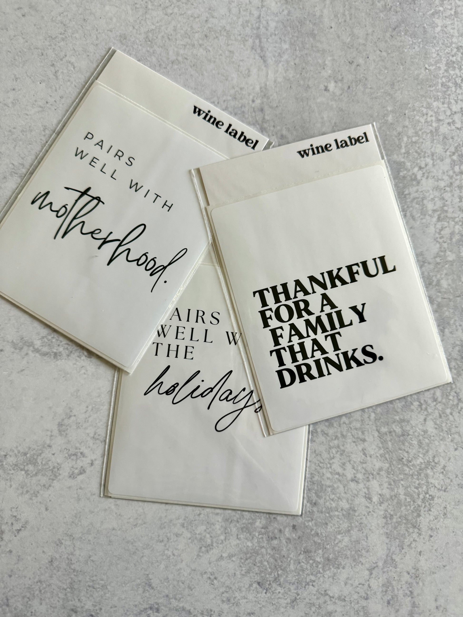 Our “Pairs Well with Motherhood” wine label is the perfect blend of classy and relatable, designed for moms who know that balance sometimes comes in a glass. Printed on a professional gloss polyester material, these labels are water-resistant, repositionable, and easy to apply — just peel, stick, and pour.